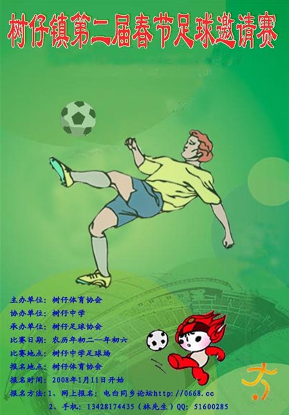 2007年树仔第一届春节足球联赛大回顾: 冠军:树仔足球代表队 亚军:电城幻影足球队 季军:水东科源数码队 第四:一芳春城足球队 文明奖:麻岗绿茵足球队 旦场东风饼铺队 最佳球员:陈拓 最佳射手:陈伟庭