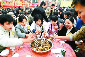 十几道菜一层层放入盆中,象征百鸟归巢,团圆富贵,祈求来年国泰民安、五谷丰登。据介绍,大盆菜的吃法十分讲究:食客持筷必须在盆中不停翻找,越是里面的菜,味道越鲜美,有“寻宝”一喻,寓意美好。