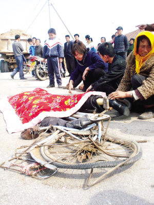 中午12时许,记者赶到现场看到,被撞身亡的女老师王格香伏在自行车上已经血肉模糊,她的家人围坐在一起痛不欲生,十多名交警正在现场调查取证。“老师,你醒醒啊!老师,你醒醒!”面对老师的离去,十多名孩子一遍一遍呼喊着老师,站在王格香的遗体旁不愿离去。