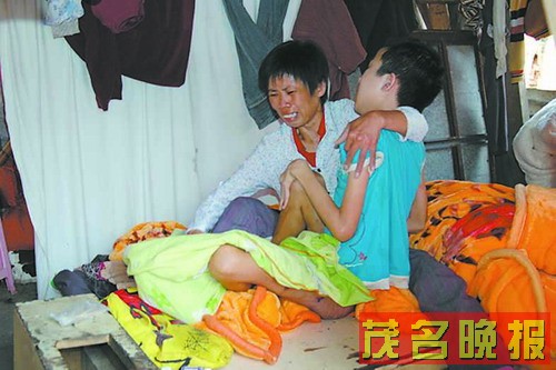在茂南区袂花镇大塘边村委会祠堂仔村,记者见到了杨家荣,他静静地躺在一个用竹子和油毡纸搭建起来的、低矮阴暗的竹棚里,空气中充斥着尿臊味和霉味,他的身旁蹲着一条黄毛狗。杨母试图扶他坐起来,但疼痛却将他折磨得咧开嘴哭,“痛、痛……”他痛苦地喊着,连脸部都被疼痛牵扯得变了型,他的眼神流露出令人心酸的痛楚和无奈。杨母见状,也心疼得嚎啕大哭。