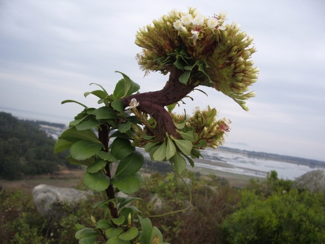 第三棵 电城庄山 长在半山腰偏上段路边,像一株四散的韭菜,中间一根独梗,梗上挂满黑果籽,四周无同株,显得有点独特.
