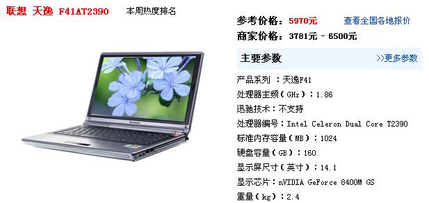 [attachmentid=172260] 联想 天逸 F41AT2390 所有参数 中关村快购网联想特价点击直销 咨询010-51666095;010-51296338;010-51296339 基本规格 处理器类型Intel Celeron Dual Core处理器主频(GHz)1.86处理器主频范围1.5GHZ-1.99GHZ二级缓存(KB)1MB迅驰技术不支持处理器编号Intel Celeron Dual Core T2390主板芯片组Intel PM965系统总线频率533标准内存容量(MB)1024内存类型DDR2扩展内存容量(MB)4096笔记本类型游戏娱乐 存储设备 硬盘容量(GB)160硬盘转速(转/分)5400光驱类型DVD刻录机光驱倍速8/4×5×6×8×10×24 显示屏 显示屏尺寸(英寸)14.1显示屏类型TFT LCD宽屏是显示屏尺寸范围14-14.9最大分辨率(dpi)1280×800 视频/音频 显示芯片nVIDIA GeForce 8400M GS显卡集成独显显存容量(MB)128音频系统内置音效芯片 网络 调制解调器56K网卡100Mbps网卡/802.11b/g(54Mbps) 输入输出 I/O接口3个USB2.0接口, Express Card接口,VGA接口,RJ11,RJ45、麦克风,耳机/音频输出,S-Video接口、1394接口蓝牙支持 外观特征 光驱软驱位置光驱内置重量(kg)2.4重量范围2Kg-2.5Kg长度(mm)340宽度(mm)253高度(mm)37 电力规格 电池类型6芯锂电池工作时间(小时)3~4 软件系统 预装操作系统Windows Vista Home Basic附带软件联想软件礼包、驱动软件、随机光盘随机附件60W电源适配器、软件光盘、说明书 环境条件