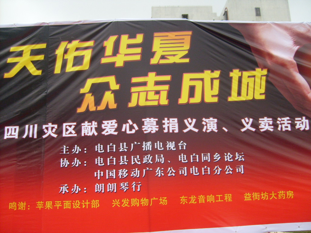 QUOTE(jackie444 @ 2008年05月22日 Thursday, 08:53 PM) 时间:23号晚上八点。 地点:东湖广场。 内容:义卖。义演。募捐。 主办单位:电白县广播电视台。 协办:电白县民政局。中国移动广东公司电白分公司。电白同乡论坛。 承办:朗朗琴行。 鸣谢:兴发购物广场。苹果平面设计部。东龙音响工程。 [snapback]2249015[/snapback]