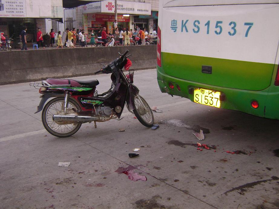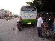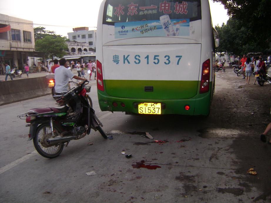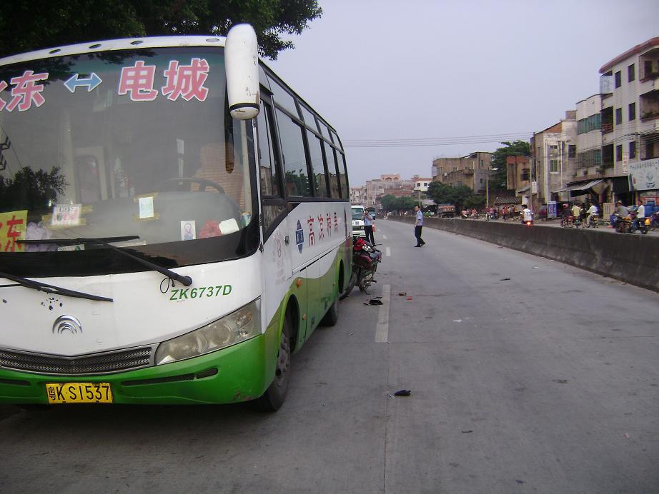 电城至水东中巴客车,下午17:30分左右,电城至水东方向行驶,因车速较快,该路口恰好是中心小学路段路口,星期日的下午就是学生正好乘车到水东读书,中巴客车为了拾客,车速较快,忽然急刹车,拾客,后面有辆老年人驶着摩托车向中巴车的后面撞去。