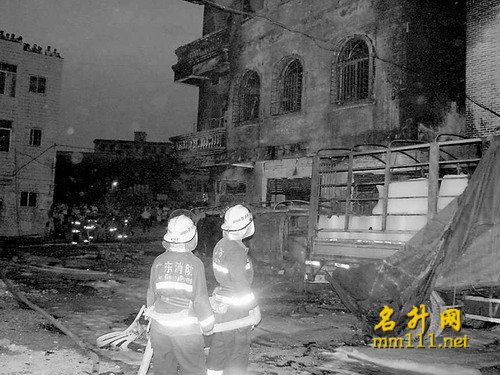 “一楼面对大衙中心小学的铁门被烧炸得严重变形。”胡说八道。上图左边的楼房比学校门口还近几米,还是白白净净的,火怎会去烧远处的铁门,吃饱撑的?从起火到火被扑灭,我一直在现场。学校早就放学了,哪还有几个学生?县长几乎是同消防队一起到达,县长到的时候火已经烧四五十分钟了,谁疏散谁?那天没有风,黑烟只向上滚,周围的建筑损伤并不严重。