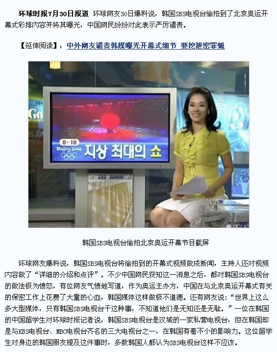 文章说“中国在与北京奥运开幕式有关的保密工作上花费了大量的心血”可是还是被韩国电视台偷拍到了,可见保密工作还是有疏漏的地方啊。“突突”份子还扬言要袭击奥运场所的,可不要麻痹大意才好。