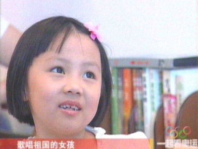 9岁的小女孩林妙可在奥运开幕式上以天真无邪的声音迷住了亿万观众,并在次日荣登《纽约时报》的头版。然而,北京奥运会开幕式音乐总监陈其钢11日在接受电视采访中却透露,8月8日开幕式上小女孩林妙可的独唱《歌唱祖国》其实是由另一位幕后小姑娘、7岁的北大附小学生杨沛宜代唱。