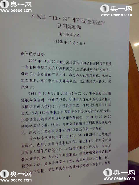 南方报业/奥一网17:22分独家消息:深圳市警方在新闻通稿中公布了今次案件事发经过,详情如下: