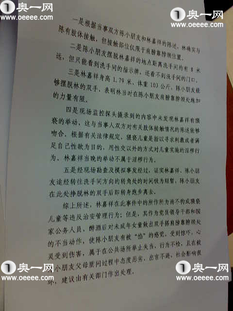 综上所述,林嘉祥在此次事件中的所作所为尚不构成猥亵儿童等违反治安管理行为。但是,其作为党员领导干部和国家公务人员,醉酒后对未成年女童做出双手搭肩膀靠脖颈处的不当动作,使陈小朋友有被“掐”的感觉,受到惊吓,心灵受到伤害,属于在公共场所举止失当、行为不检,且在被陈小朋友父母质问过程中态度恶劣、出言不逊,社会影响很坏,建议由有关部门作出处理。