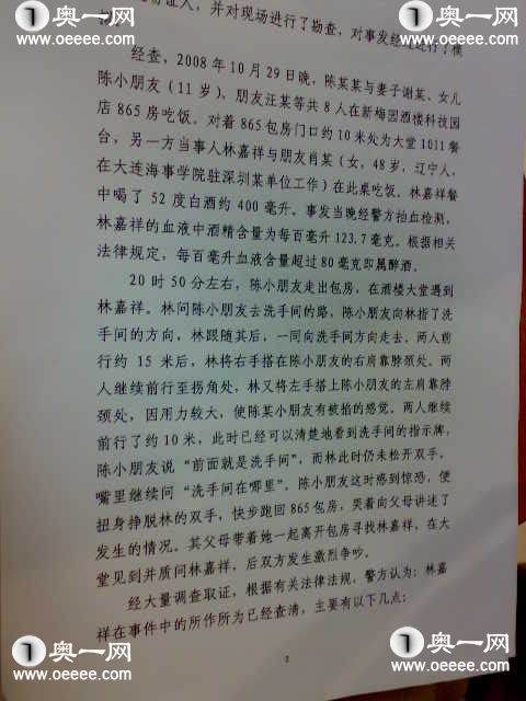 20时50分左右,陈小朋友走出包房,在酒楼大堂遇到林嘉祥,林问陈小朋友去洗手间的路,陈小朋友向林指了洗手间的方向,林跟随其后,一同向洗手间方向走去。两人前行约15米后,林将右手搭在陈小朋友的右肩靠脖颈处,两人继续前行至拐角处,林又将左手搭上陈小朋友的左肩靠脖颈处,因用力较大,使陈某小朋友有被掐的感觉。两人继续前行了约10米,此时已经可以清楚地看到洗手间的指示牌,陈小朋友说“前面就是洗手间”,而林此时仍未松开双手,嘴里继续问“洗手间在哪里”。陈小朋友这时感到惊恐,便扭身体挣脱林的双手,快步跑回865包房,哭着向父母讲述了发生的情况。其父母带着她一起离开包房寻找林嘉祥,在大堂见到并质问林嘉祥,后双方发生激烈争吵。