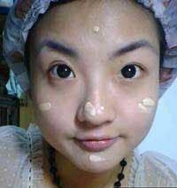 4、涂粉底液(品牌我用的是韩国的蝉真,不要涂的太厚,不然妆看上去很假~在颧骨周围涂比肤色更深些的粉底。在T字部位涂比肤色更浅些的粉底,将脸部变小,在下巴周围涂比肤色更浅些的粉底也可以起到拉长脸型的效果哦!)
