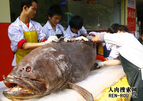 据店老板介绍,这条石斑鱼是他们位于南澳本港海域供货基地的渔民于昨天凌晨时分在附近深海海域钓到的,起钓的时候花了一个多小时,颇费一番周折,甚至请潜水员下水帮忙才将鱼弄上渔船。由于大石斑鱼一般都是生活在深海里的,离开水后不久就死了,以至于起水后连夜被送到珠海进行保鲜。