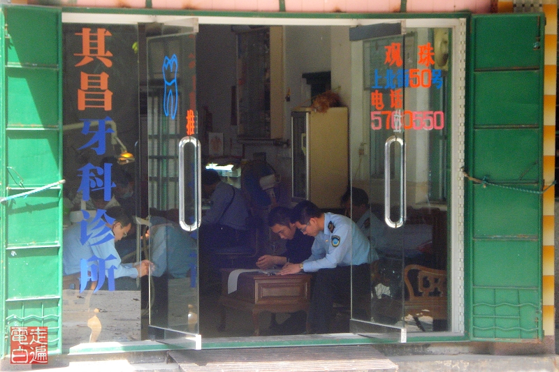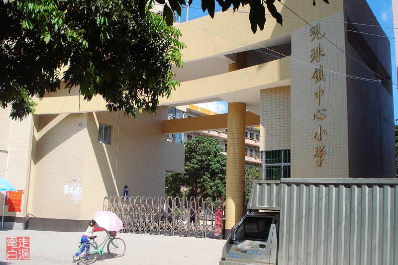 在学校对面等待进校的学生。学校的门是开的,但是没有学生进校。看来很遵守纪律。