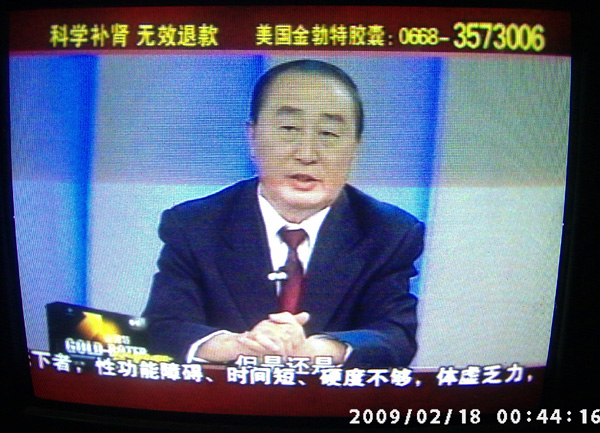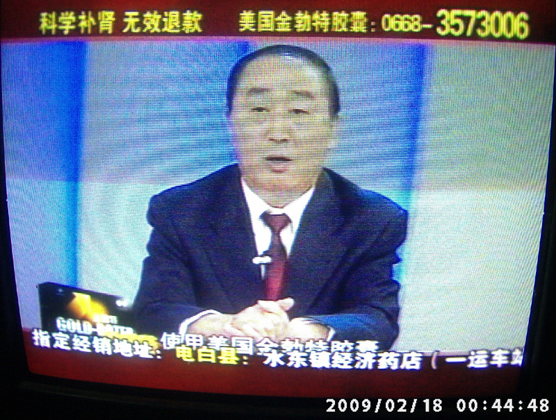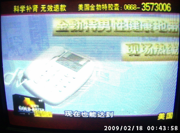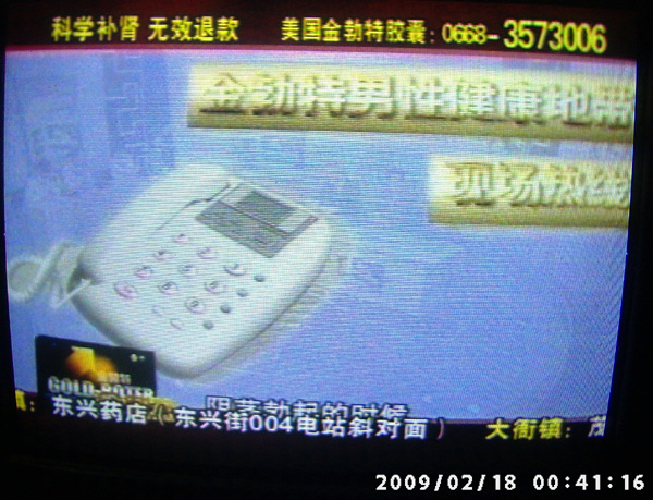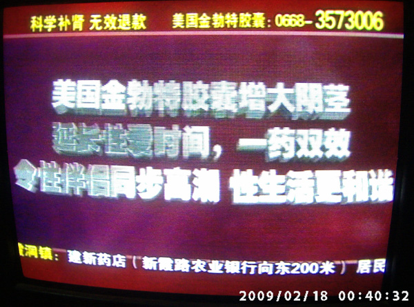 但某县有线电视台2009年2月18日仍在播放涉嫌虚假违法的医疗和药品广告(见下图)。