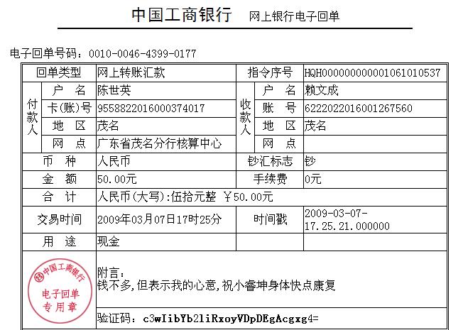 另外,我想,写个“网上千人爱心接力捐助广东电白小睿坤”的帖子,发到中国志愿者网站,还有,让同学朋友们转发到各个社区、志愿者的群里,如果赖先生把工行卡办好了,就可以添加上这张卡的卡号,多一个比较方便的捐款渠道,全国各地的热心人就可以往这个工行卡转账了。这样可以吸引更多的善款。