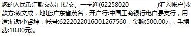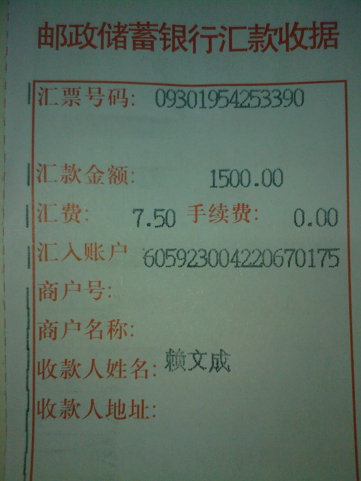 我一在东莞工作的同学今天汇了500元!感谢他!