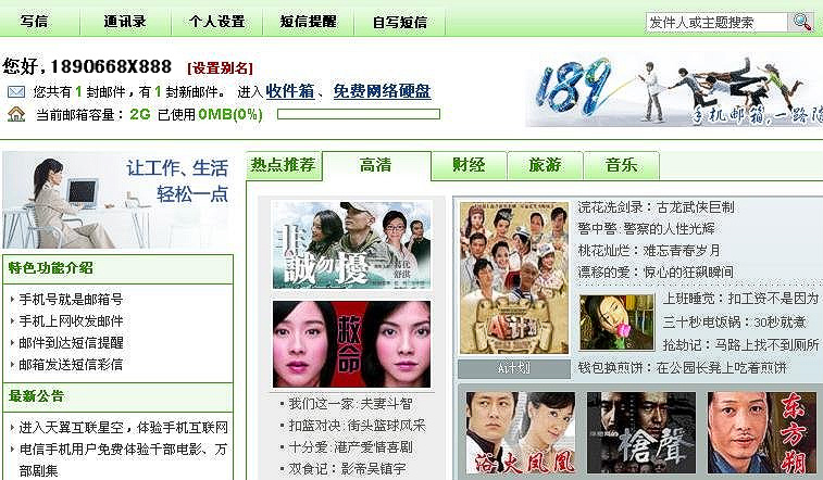 日前,电信部门已为天翼手机用户开通了邮箱名为“手机号@189.cn”的189邮箱,189、133、153手机用户登录 www.189.cn 就可激活邮箱。 189邮箱特色功能介绍: 在邮箱每月发 50 条短信免费 邮件到达手机短信通知 手机上网收发邮件 邮箱发送短信彩信 189邮箱超大容量:2G 手机号就是邮箱号 (电信手机189、133、153号段均可申请使用) 电信手机用户登录189邮箱可以免费体验千部高清电影、万部剧集 大家都来试试189邮箱吧