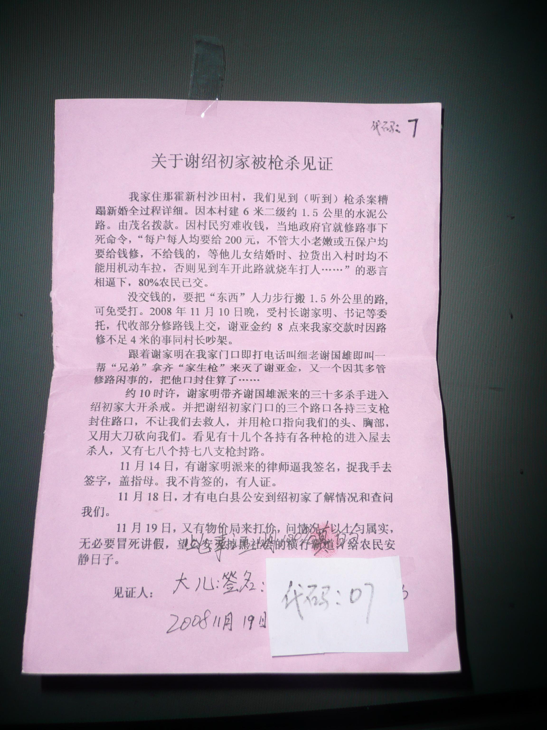 此致受害家人:谢绍初、谢亚金、谢亚喜、谢家贵