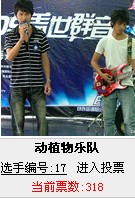 手机投票方式:http://www.mmyyw.com点击打开那个蓝色的地方写着“2009盖世群音,百事可乐大赛”选择乐队投票,找到《动植物》投一票就行了…