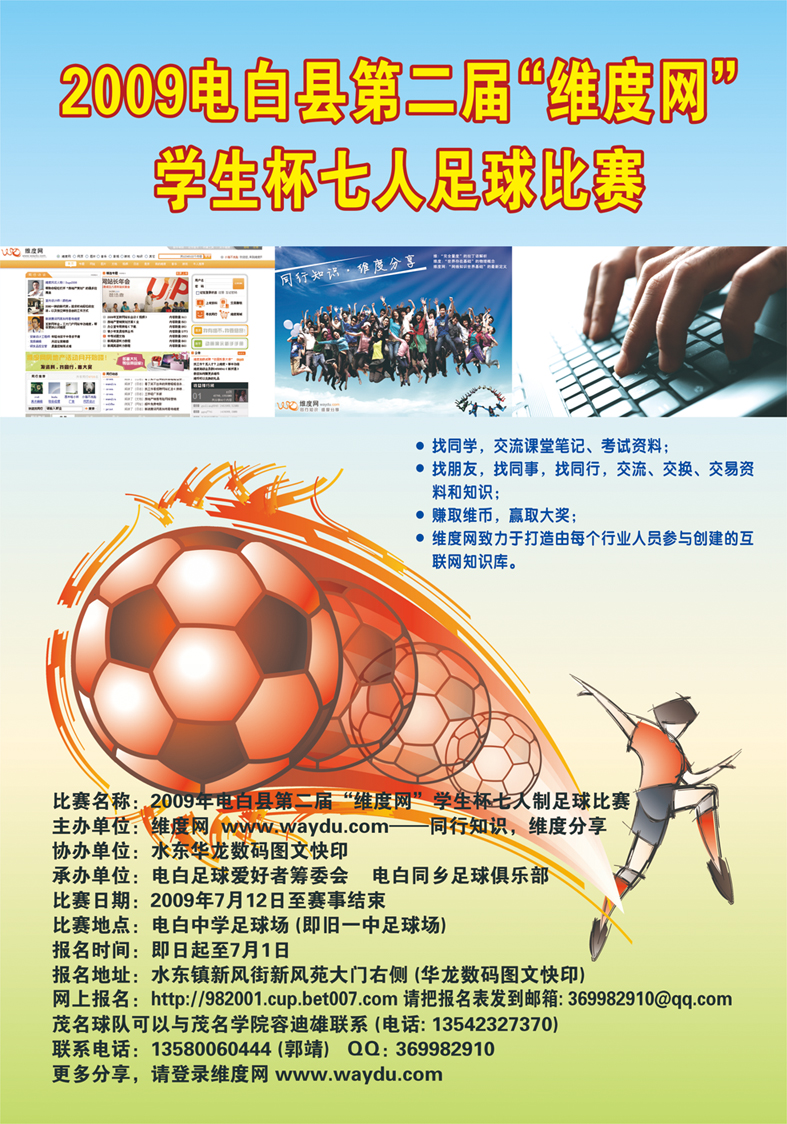 华 华龙快印 初中三年级 注册 2008-02-04 消息 502 反馈评分 0 点数 1 2009-06-29 #1 2009电白第二届“维度网”学生杯七人足球赛的宣传海报出来了,届时会将海报贴于各学校门口和足球场等地方,请大家支持一下![attachmentid=216396] 附件 海报-上传+.jpg 175.8 KB · 查看: 507