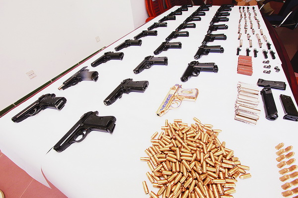 近3年来我省最大制贩枪支案中缴获的手枪及子弹。